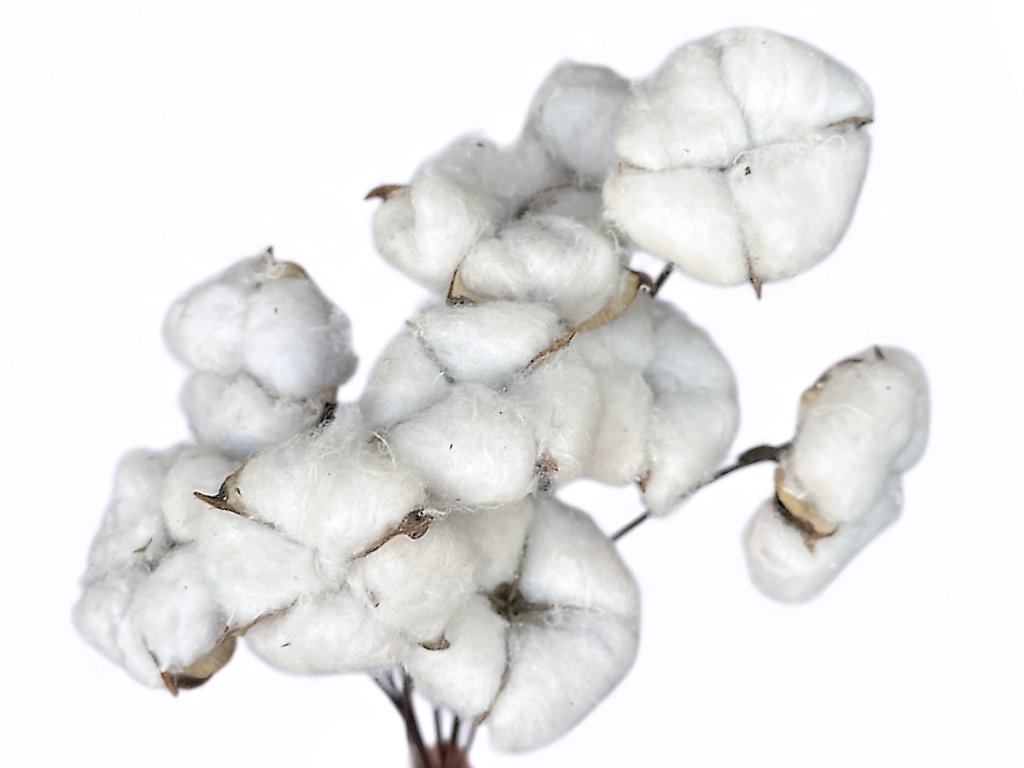 Cotton (lat. Gossypium) is cultivated for its soft pods, which naturally open upon ripening, revealing a white fluffy structure. The flowers are hand-picked, gently dried, and then attached to natural rattan stems, which enhance their rustic and ecological character.
