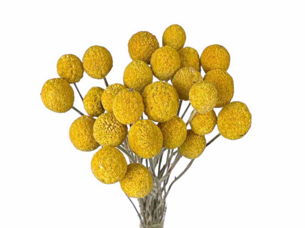 Craspedia originates from Australia and New Zealand, where it grows as a wild perennial. The flowers are harvested during their most intense coloring, dried naturally by air, thus retaining their round shape and rich yellow color without further dyeing. This variant is 100% natural and undyed.