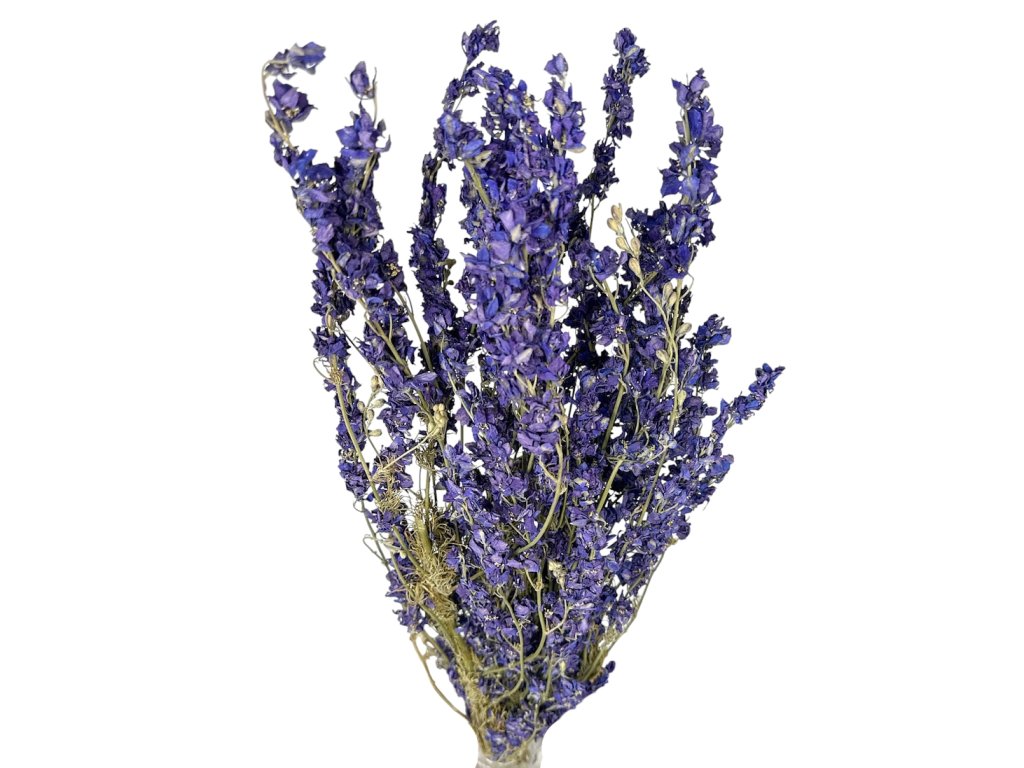 Delphinium originates from the Mediterranean and Asian regions, where it grows in meadows and fields. The flowers are hand-picked at full bloom, and then the bunches are dried naturally in the air. This process preserves the vibrant colour and delicate texture of the flowers.