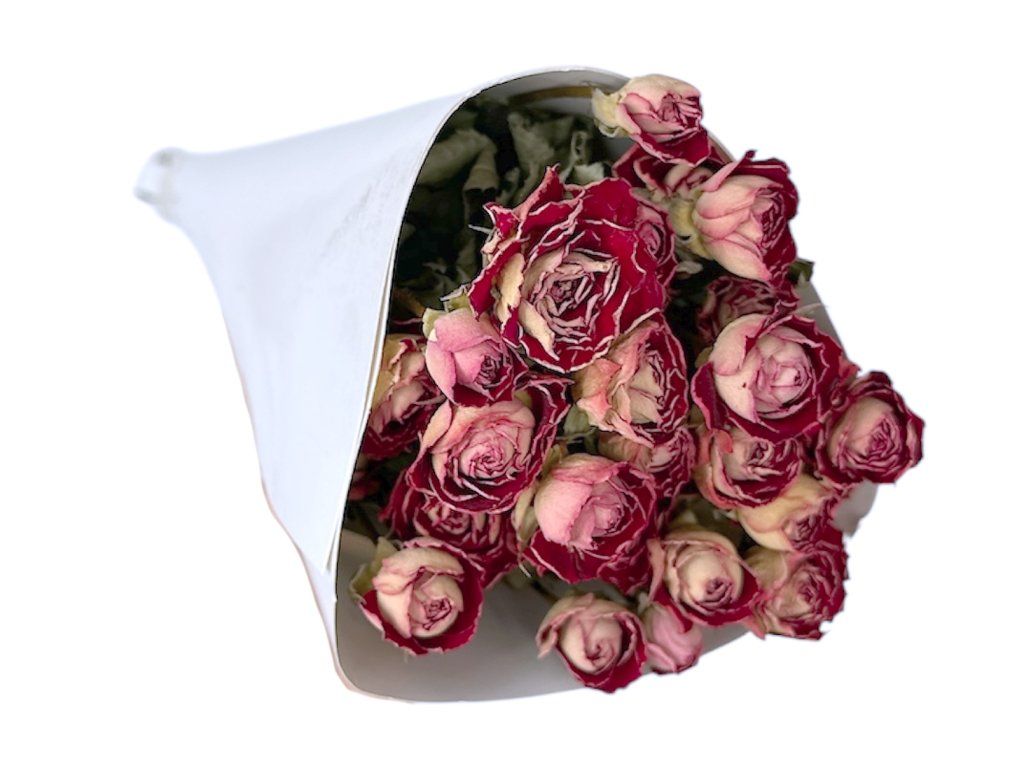 Mini roses are small jewels of the floral world. Their symmetrical blooms are a symbol of romance, love, and tenderness, making them popular in wedding floristry and for decorating girls' rooms or elegant interiors. The ombré transition gives each rose a modern and dynamic look that catches the eye and appears timeless. In the past, roses were also used as talismans to protect the home and as a symbol of beauty.