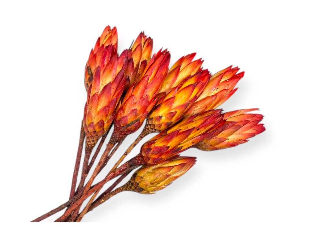 We recommend storing dried protea buds on stems in a dry, dark place, away from direct sunlight. Do not use water or sprays - they may lose their shape or color. Gently remove dust by blowing or using the cold air setting on a hairdryer.