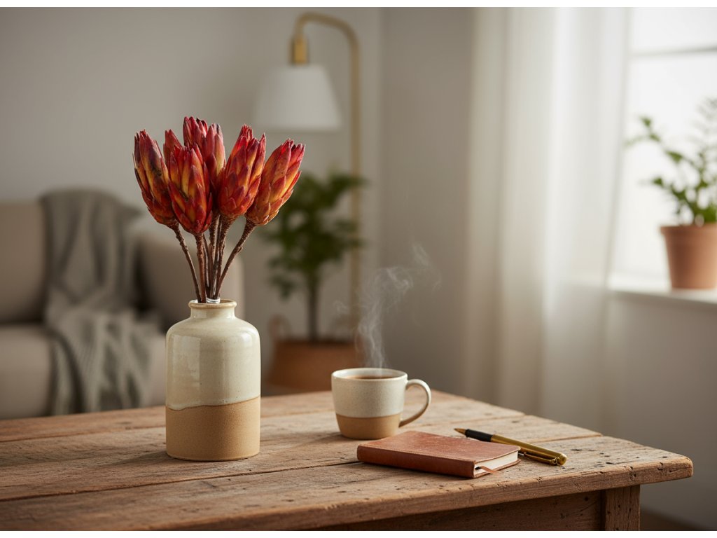 Combine them with natural materials such as lagurus, phalaris, dried cones, or moss to create harmonious and long-lasting arrangements. Protea buds on stems are suitable not only for classic decorations but also for minimalist and modern interiors.