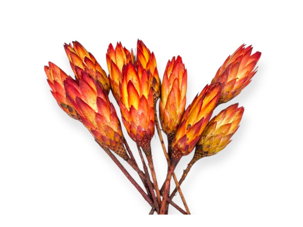 Dried protea buds on stems are ideal for creating elegant and striking arrangements. The entire stem is 35–40 cm long, the bud itself 8–10 cm, allowing them to be used as a dominant element in bouquets, wreaths, or modern decorations. They stand out with their rich red color and sculptural shape, which is captivating even as a standalone element in a vase.