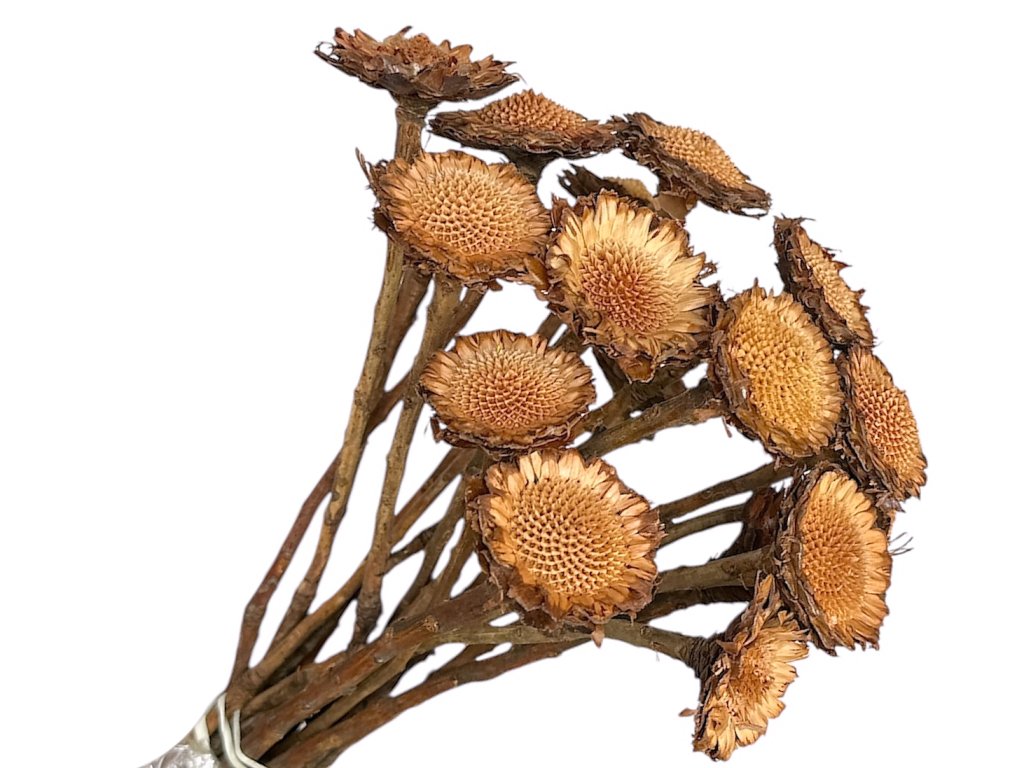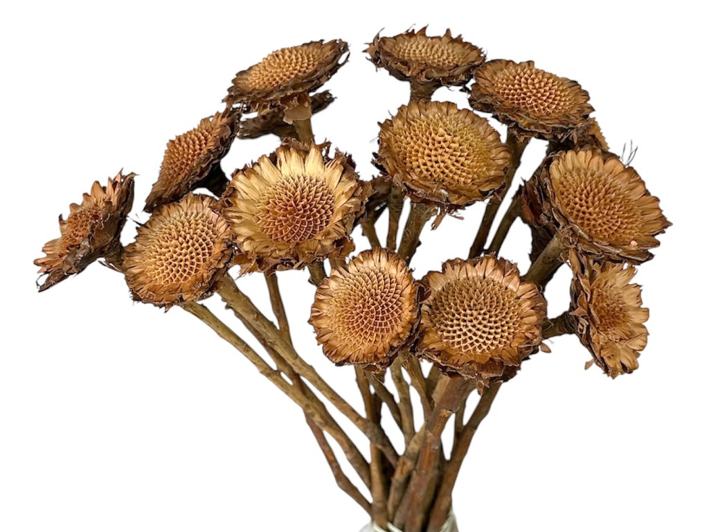 Protea originates from South Africa, where its flowers are characterized by a distinct structure and a firm stem. After harvesting, the individual flower heads are dried and treated to preserve their shape and natural appearance. Flowers without petals are popular for their versatility in arrangements.